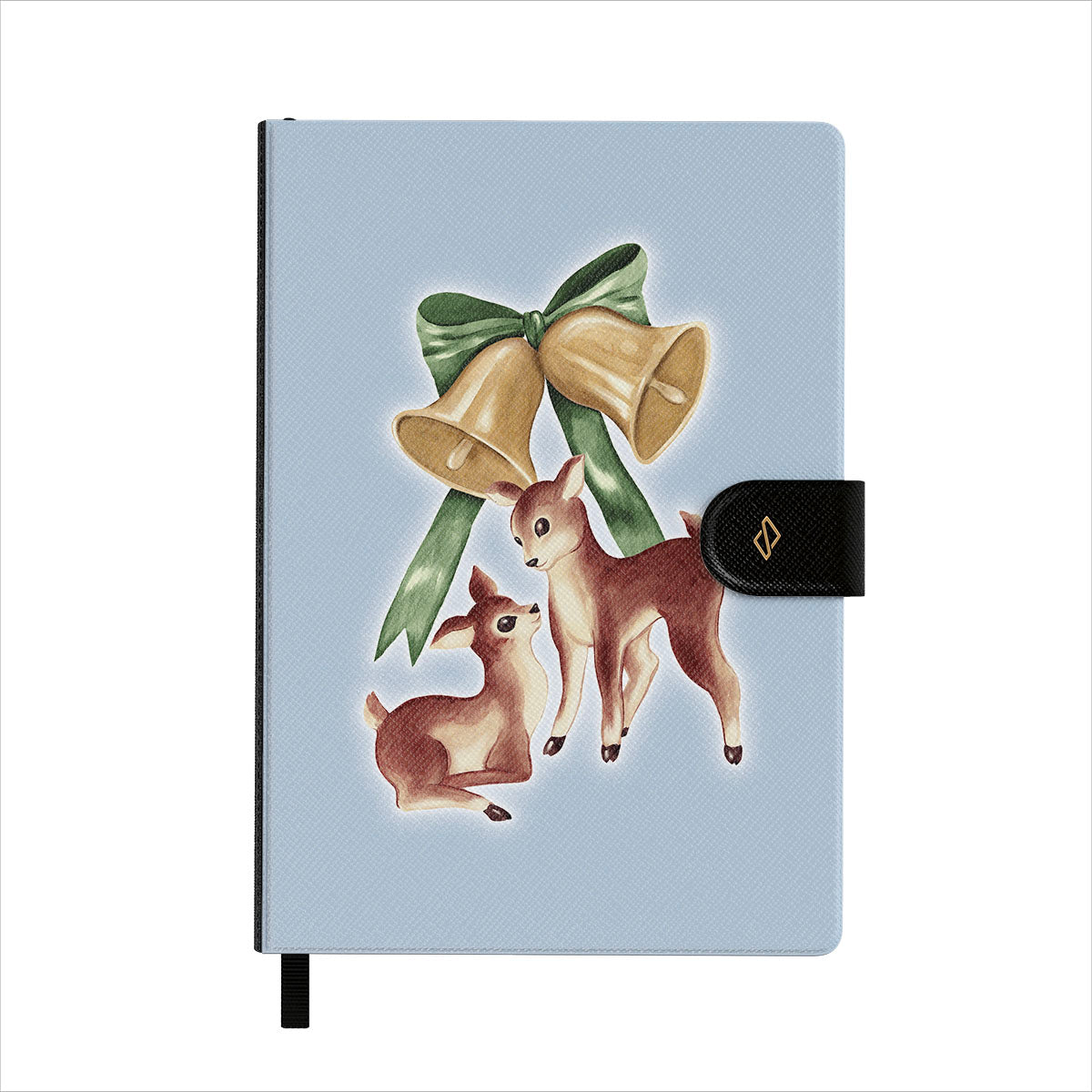 Este design contém: rena vintage, sinos de Natal, sinos dourados, ilustração retro de rena, cervo bebê, fundo azul claro