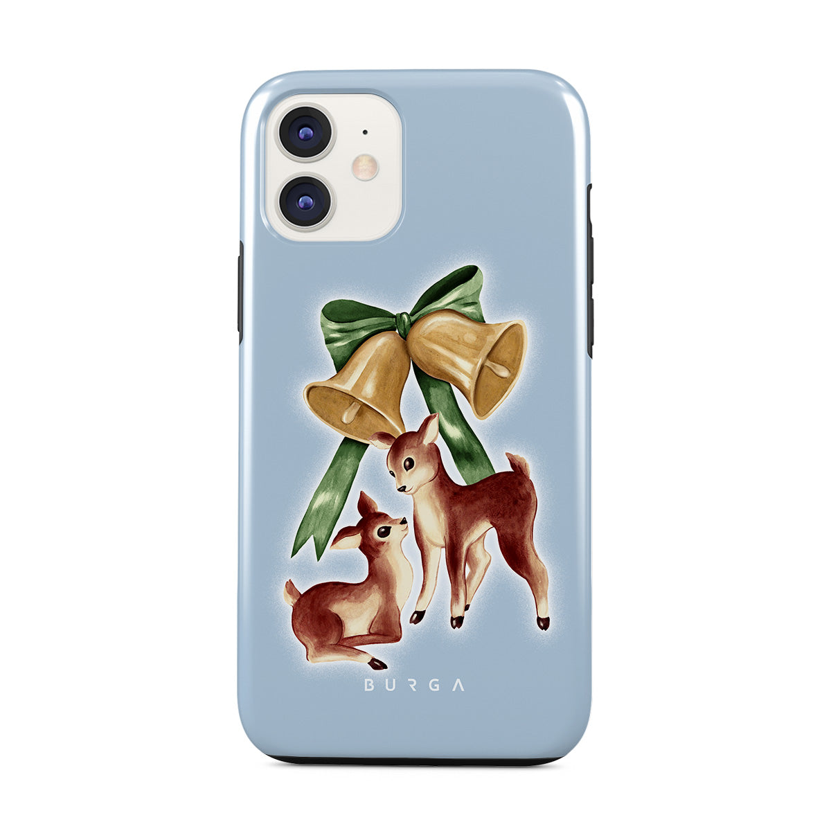 Este design contém: rena vintage, sinos de Natal, sinos dourados, ilustração retro de rena, cervo bebê, fundo azul claro