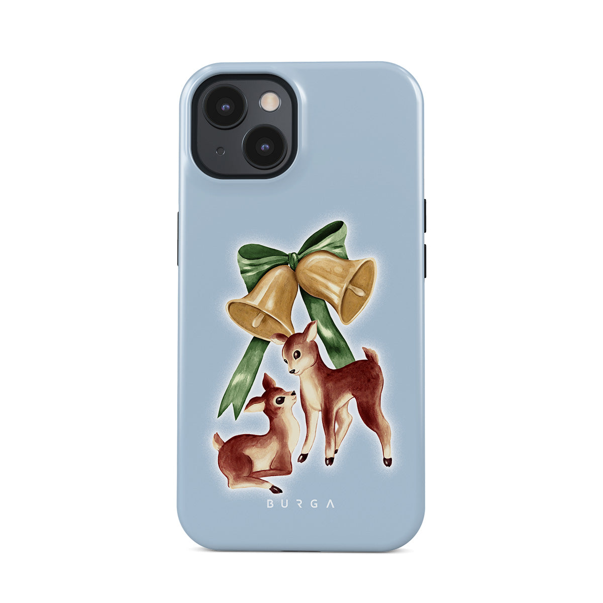 Este design contém: rena vintage, sinos de Natal, sinos dourados, ilustração retro de rena, cervo bebê, fundo azul claro