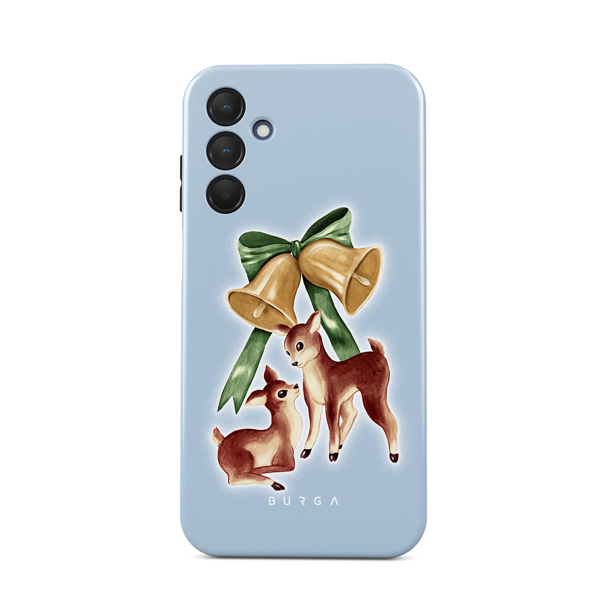 Este design contém: rena vintage, sinos de Natal, sinos dourados, ilustração retro de rena, cervo bebê, fundo azul claro