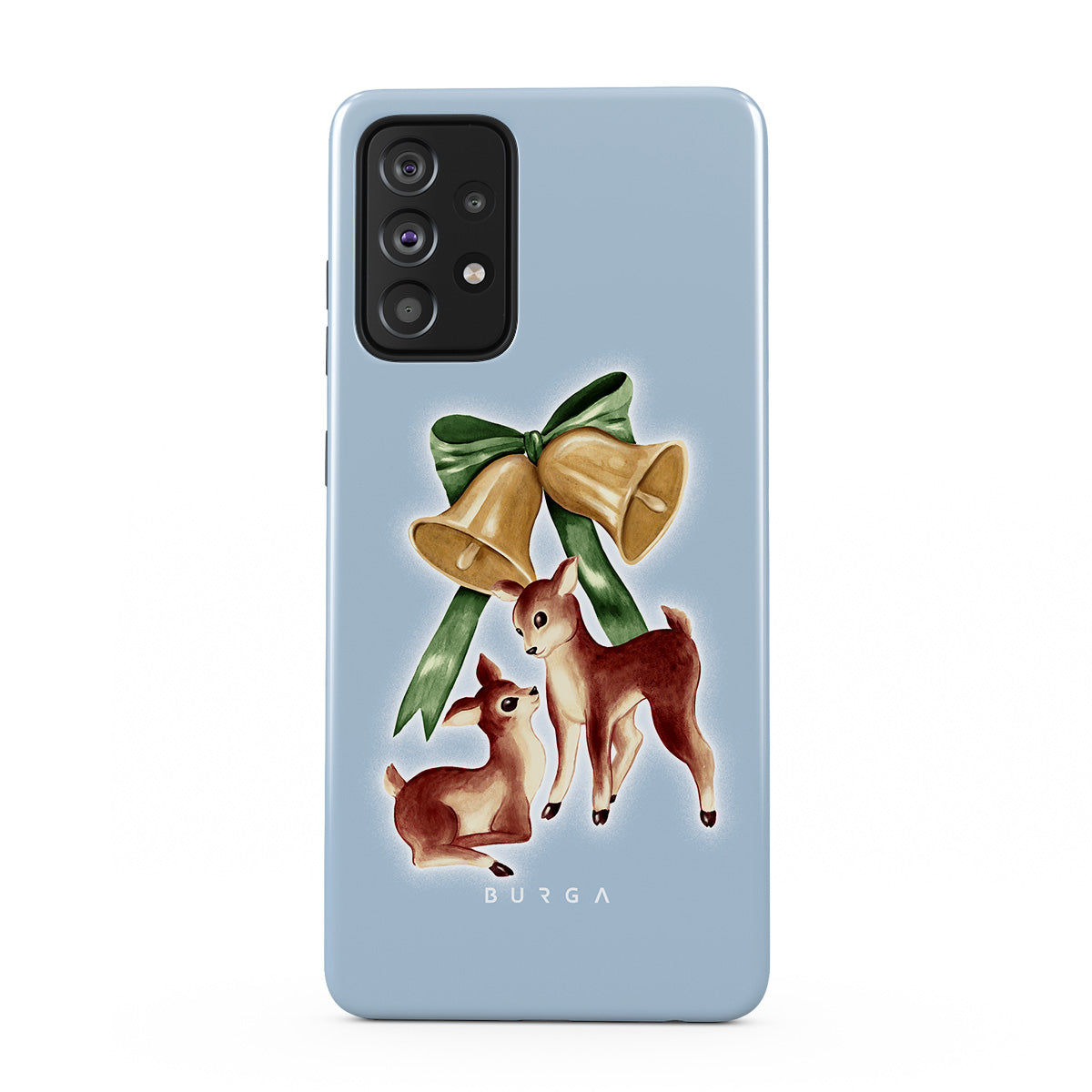 Este design contém: rena vintage, sinos de Natal, sinos dourados, ilustração retro de rena, cervo bebê, fundo azul claro