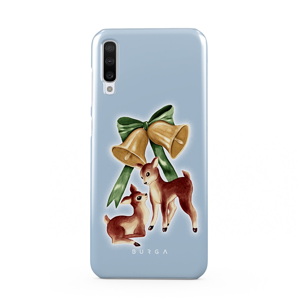 Este design contém: rena vintage, sinos de Natal, sinos dourados, ilustração retro de rena, cervo bebê, fundo azul claro