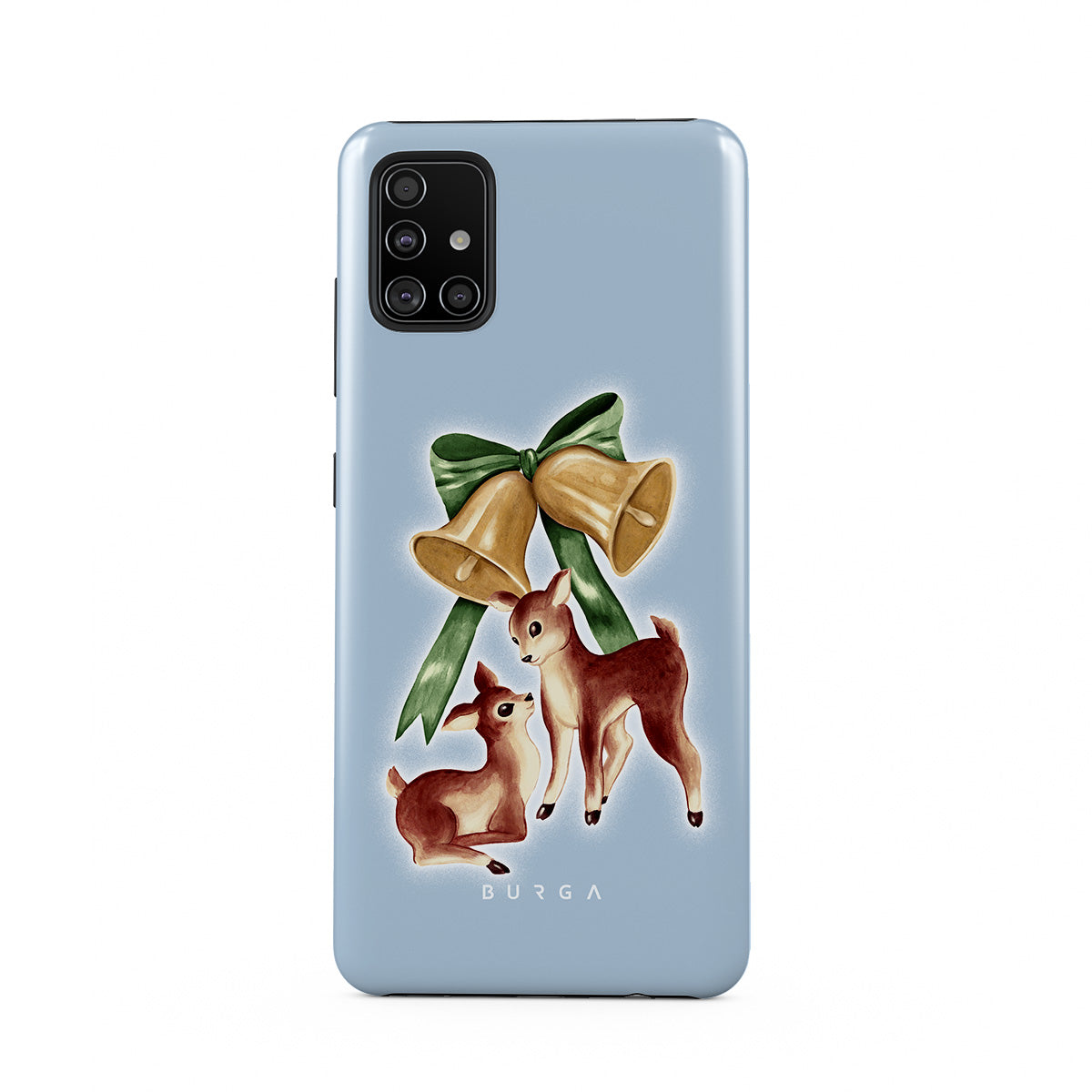 Este design contém: rena vintage, sinos de Natal, sinos dourados, ilustração retro de rena, cervo bebê, fundo azul claro
