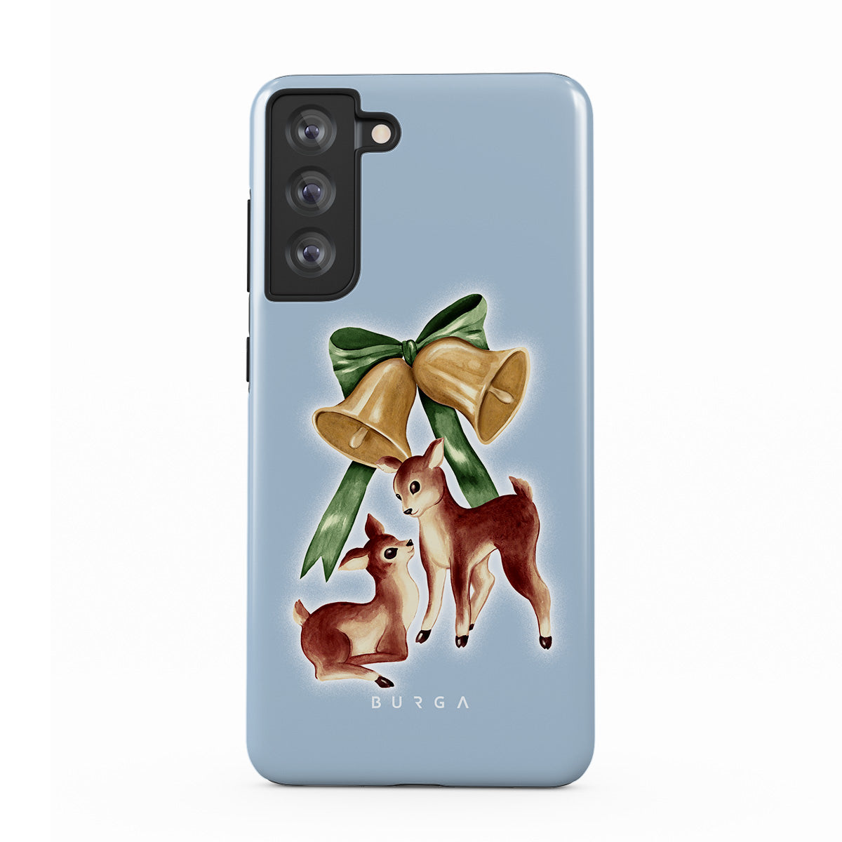 Este design contém: rena vintage, sinos de Natal, sinos dourados, ilustração retro de rena, cervo bebê, fundo azul claro