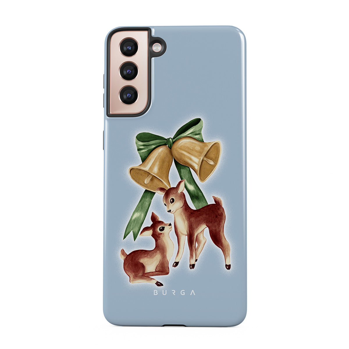 Este design contém: rena vintage, sinos de Natal, sinos dourados, ilustração retro de rena, cervo bebê, fundo azul claro