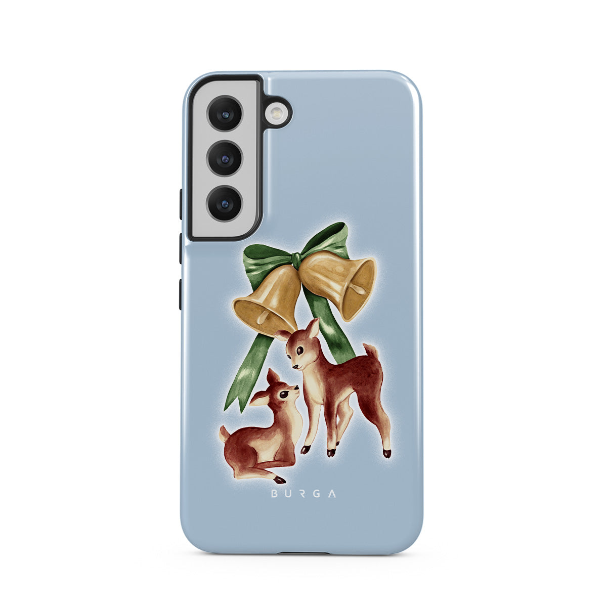 Este design contém: rena vintage, sinos de Natal, sinos dourados, ilustração retro de rena, cervo bebê, fundo azul claro