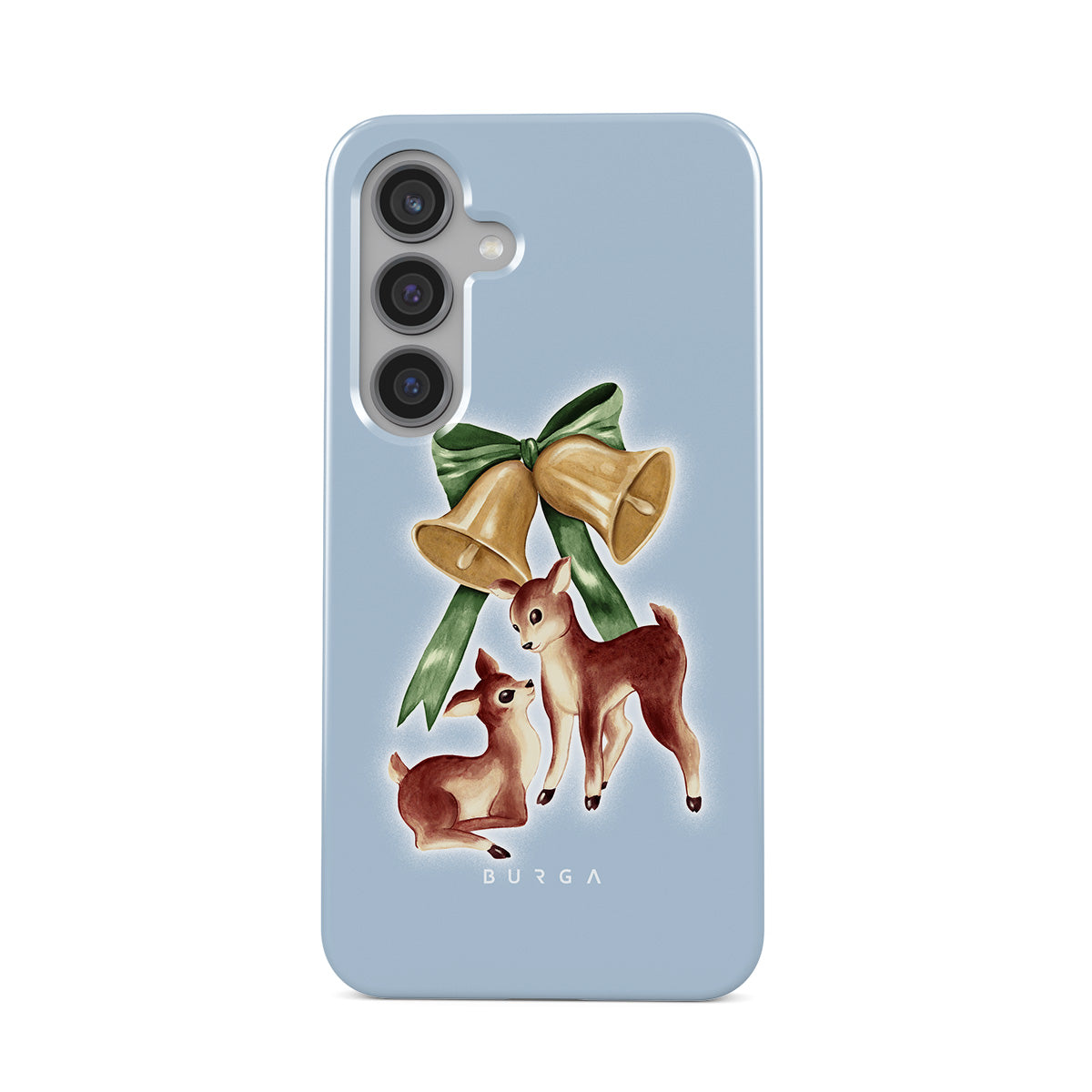 Este design contém: rena vintage, sinos de Natal, sinos dourados, ilustração retro de rena, cervo bebê, fundo azul claro