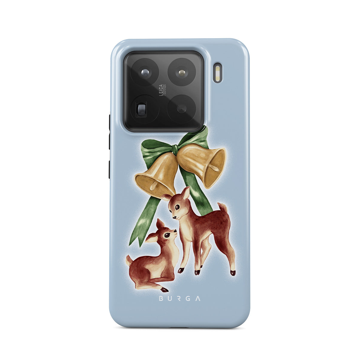 Este design contém: rena vintage, sinos de Natal, sinos dourados, ilustração retro de rena, cervo bebê, fundo azul claro