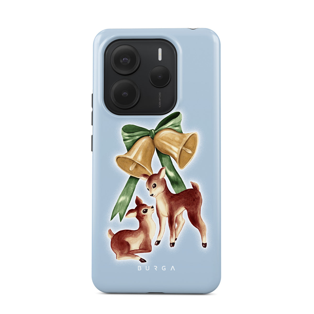 Este design contém: rena vintage, sinos de Natal, sinos dourados, ilustração retro de rena, cervo bebê, fundo azul claro
