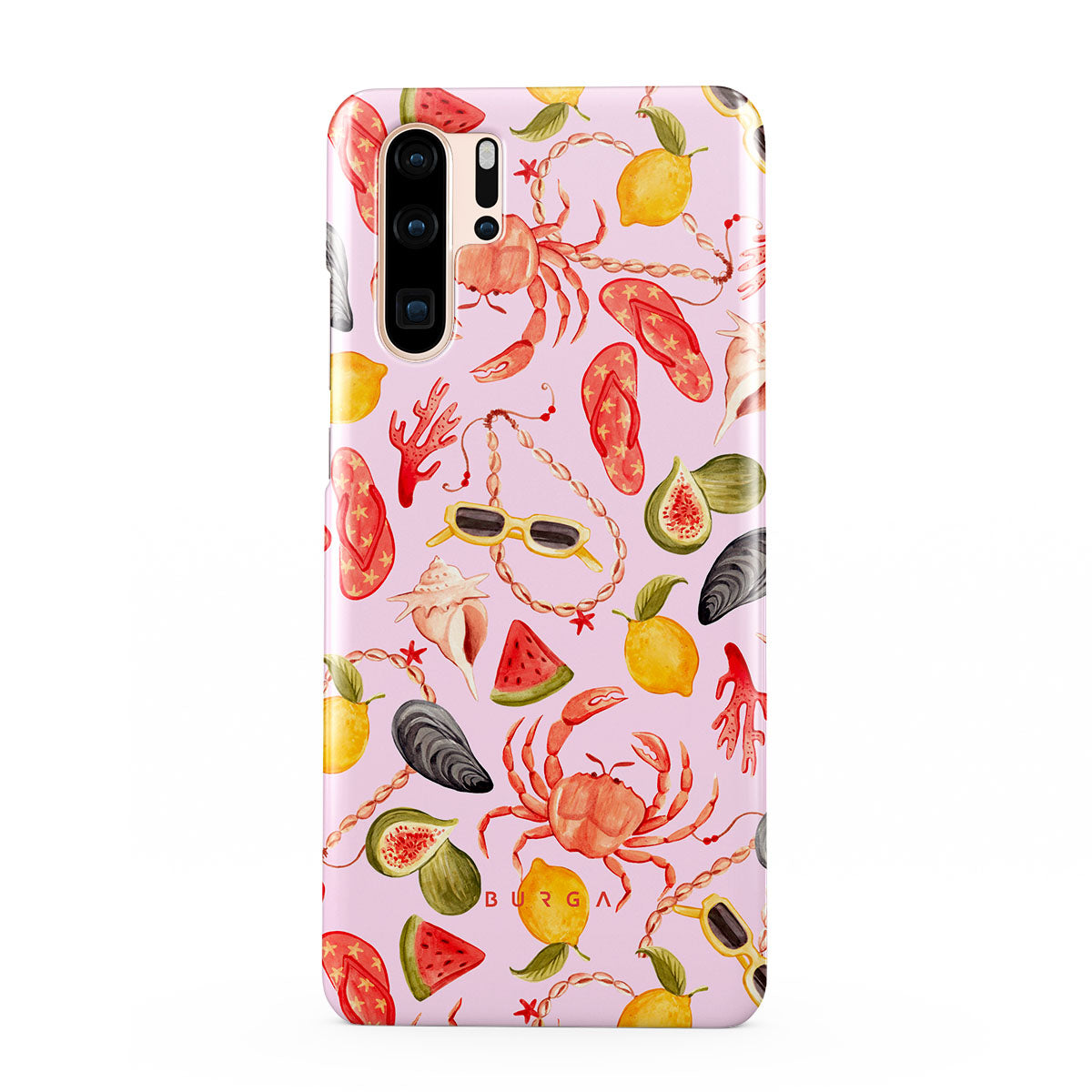 Este design contém: melancia, óculos de sol, frutos do mar, caranguejo, chinelos, ostras, limão, cores vibrantes, tema tropical