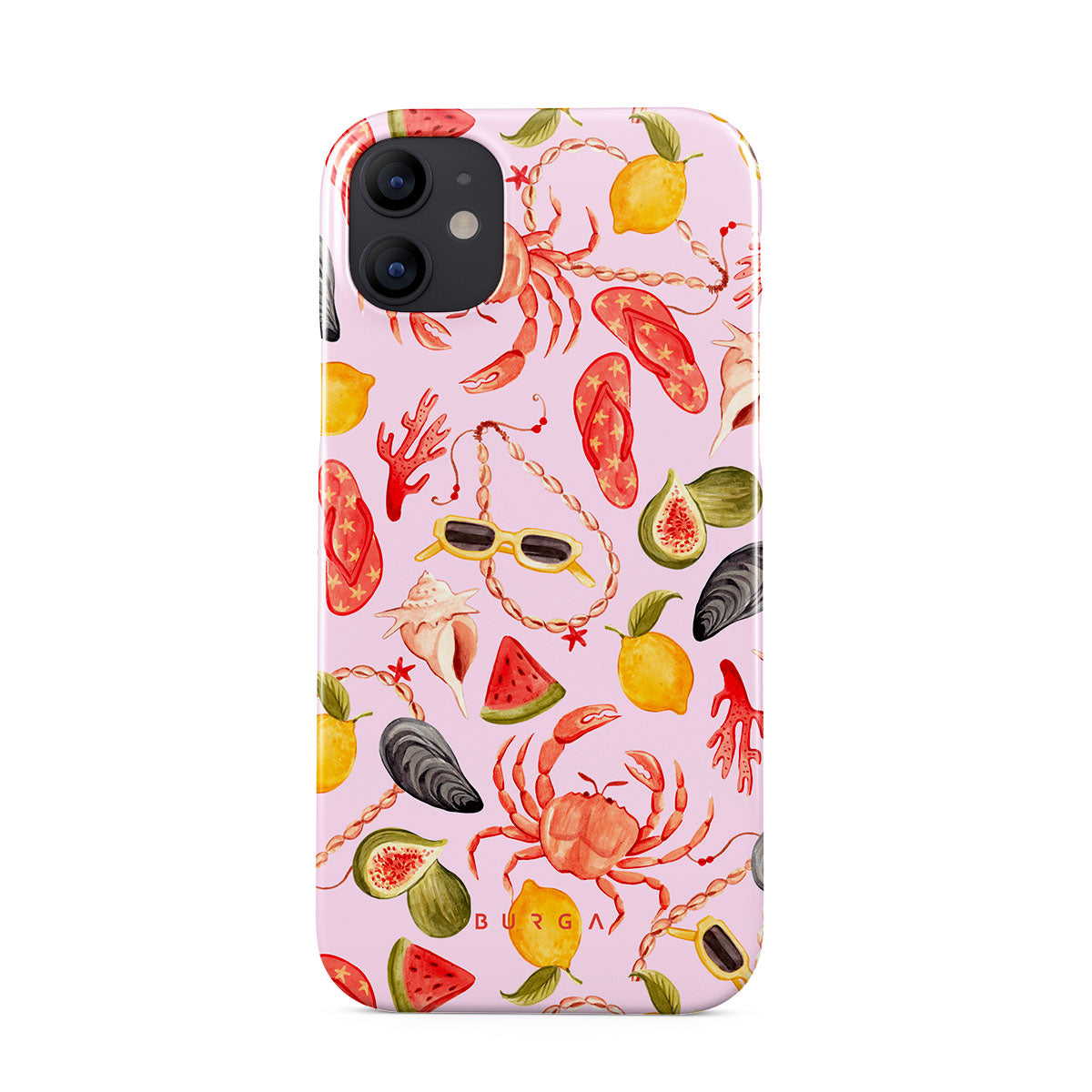 Este design contém: melancia, óculos de sol, frutos do mar, caranguejo, chinelos, ostras, limão, cores vibrantes, tema tropical