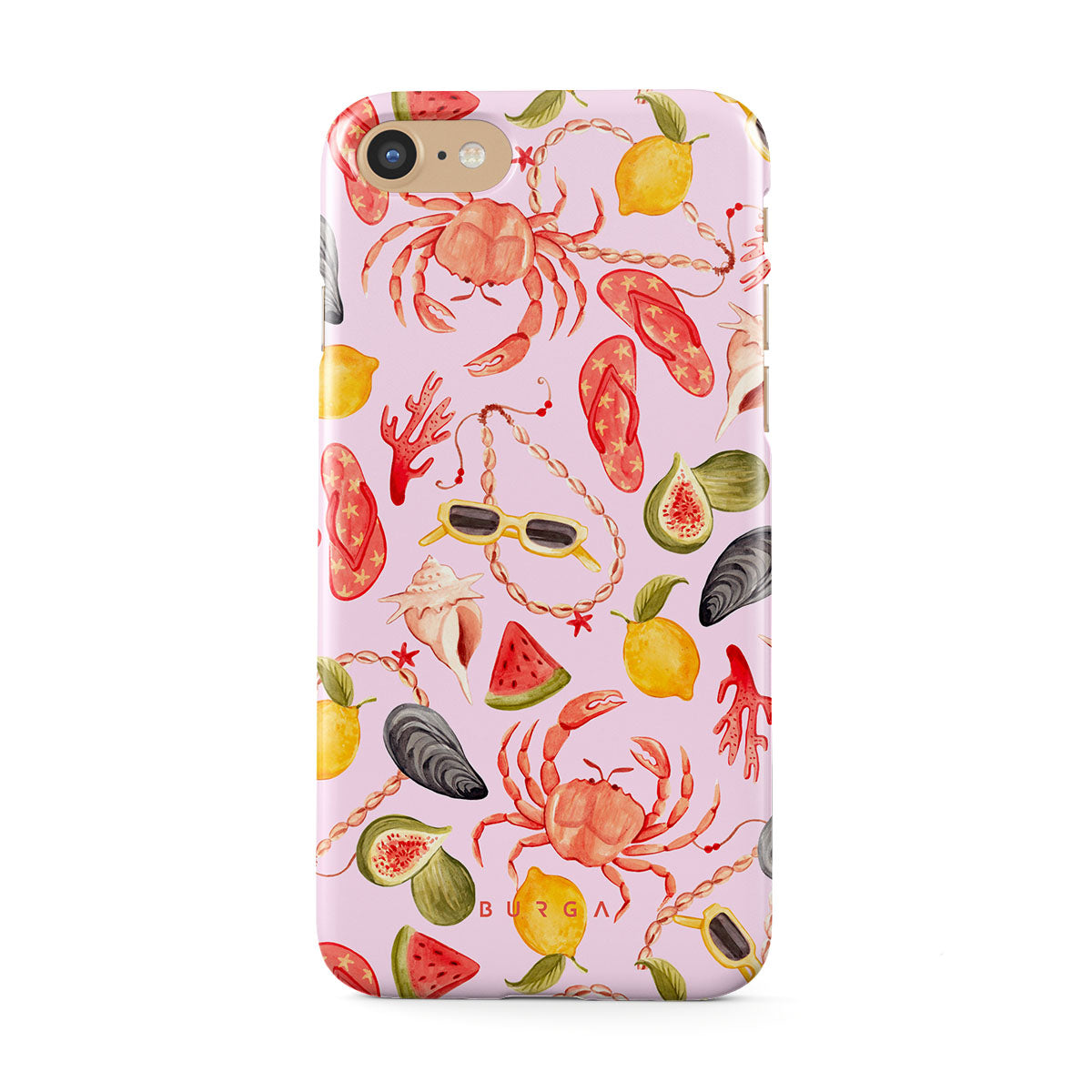 Este design contém: melancia, óculos de sol, frutos do mar, caranguejo, chinelos, ostras, limão, cores vibrantes, tema tropical