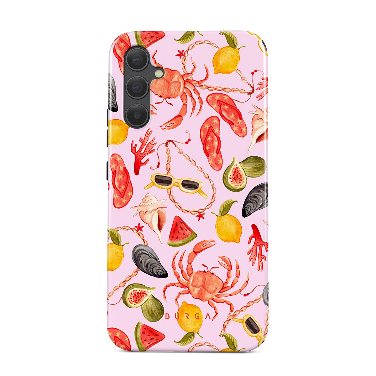 Este design contém: melancia, óculos de sol, frutos do mar, caranguejo, chinelos, ostras, limão, cores vibrantes, tema tropical