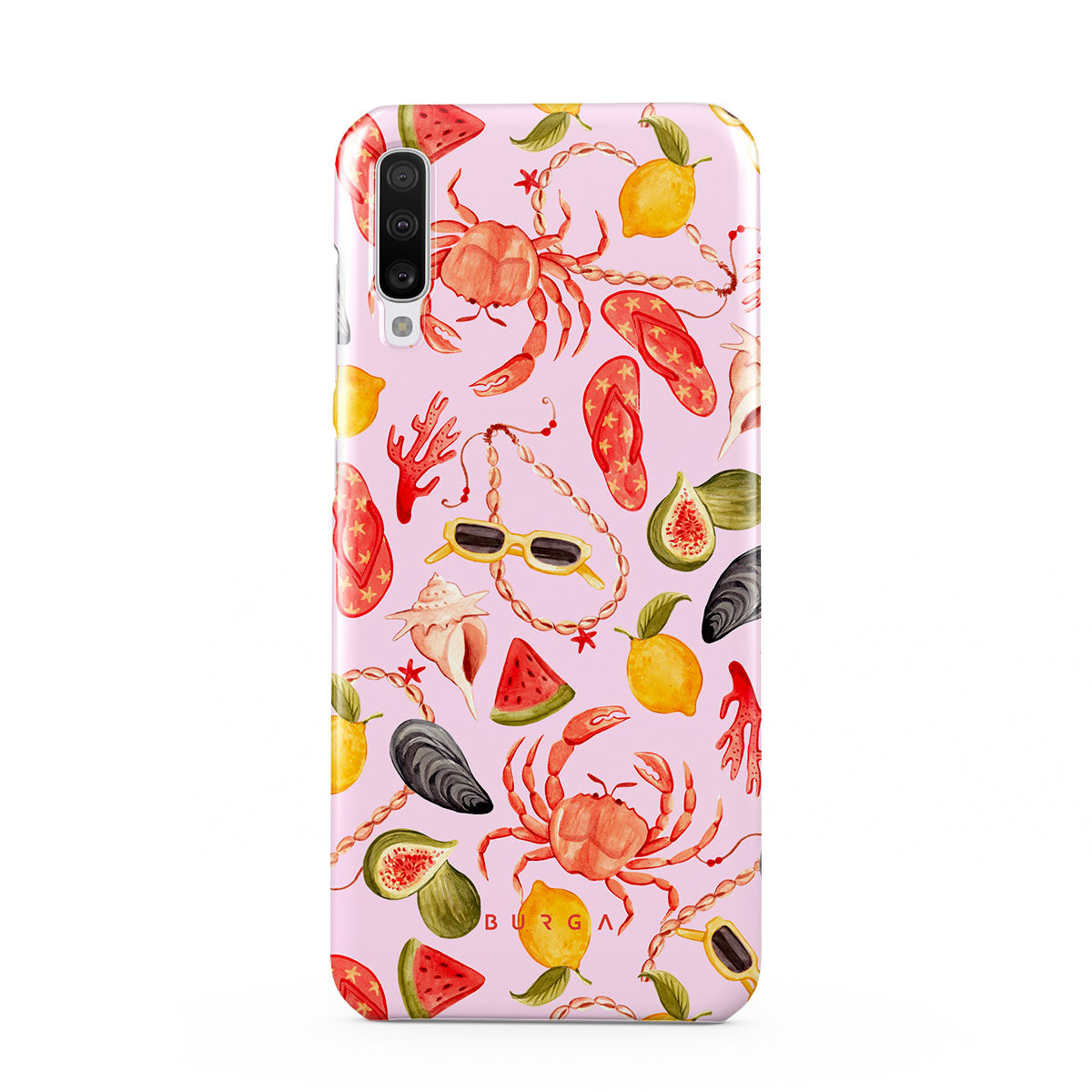 Este design contém: melancia, óculos de sol, frutos do mar, caranguejo, chinelos, ostras, limão, cores vibrantes, tema tropical