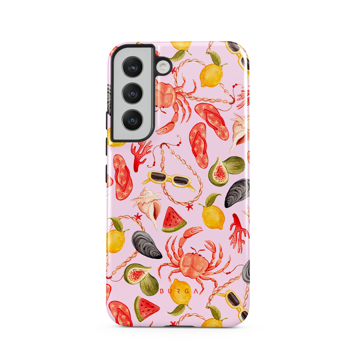 Este design contém: melancia, óculos de sol, frutos do mar, caranguejo, chinelos, ostras, limão, cores vibrantes, tema tropical