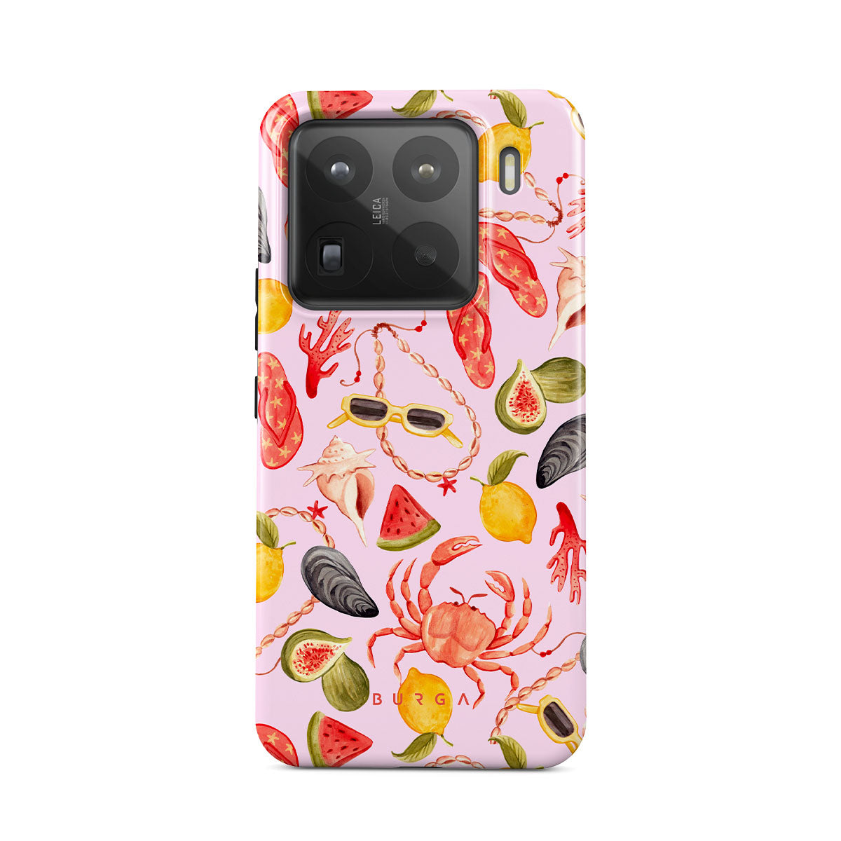 Este design contém: melancia, óculos de sol, frutos do mar, caranguejo, chinelos, ostras, limão, cores vibrantes, tema tropical