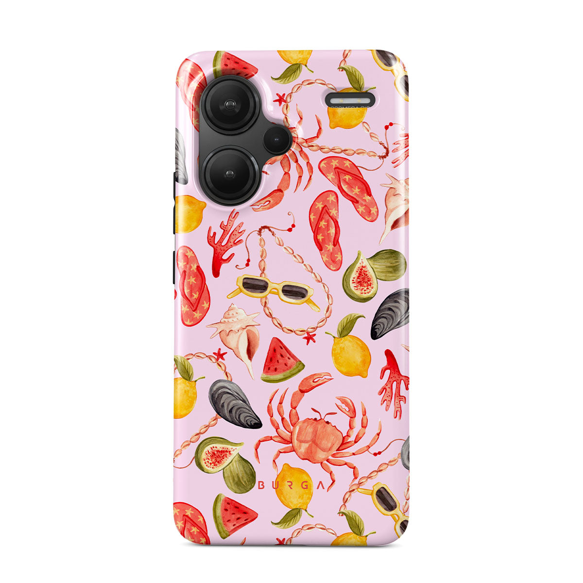 Este design contém: melancia, óculos de sol, frutos do mar, caranguejo, chinelos, ostras, limão, cores vibrantes, tema tropical