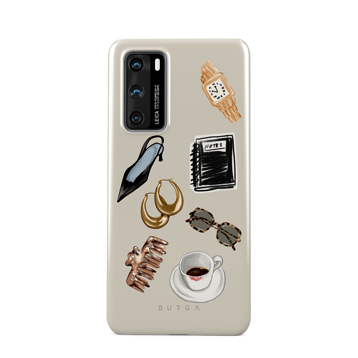 Este design contém: salto alto preto, argolas douradas, caderno preto, chávena de café, óculos com padrão tartaruga, scrunchie castanho, relógio dourado retro.