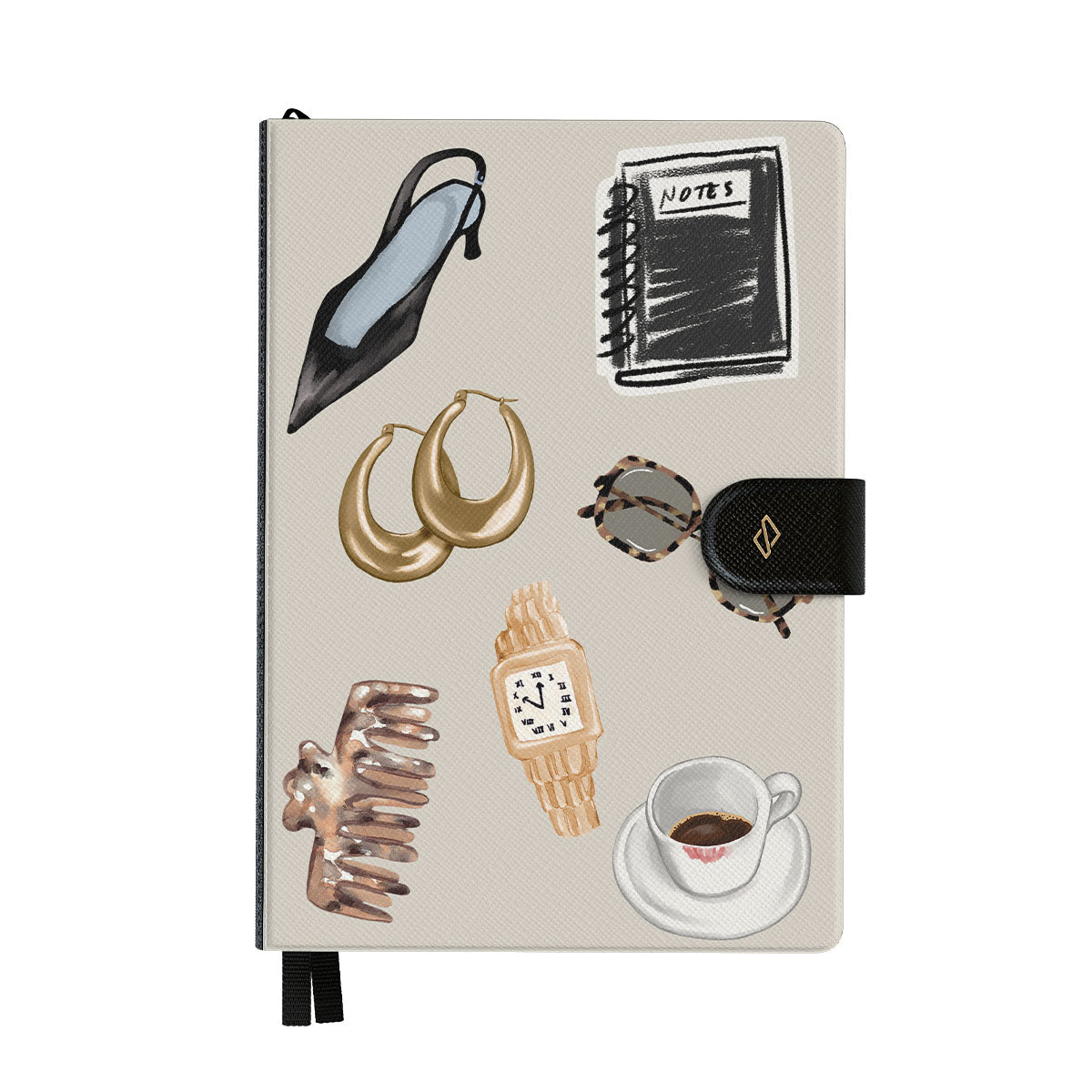 Este design contém: salto alto preto, argolas douradas, caderno preto, chávena de café, óculos com padrão tartaruga, scrunchie castanho, relógio dourado retro.