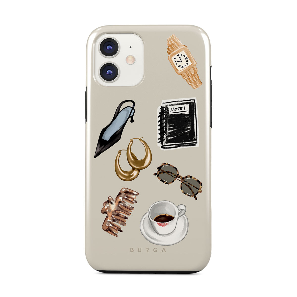 Este design contém: salto alto preto, argolas douradas, caderno preto, chávena de café, óculos com padrão tartaruga, scrunchie castanho, relógio dourado retro.