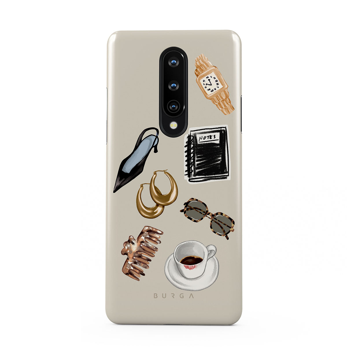 Este design contém: salto alto preto, argolas douradas, caderno preto, chávena de café, óculos com padrão tartaruga, scrunchie castanho, relógio dourado retro.