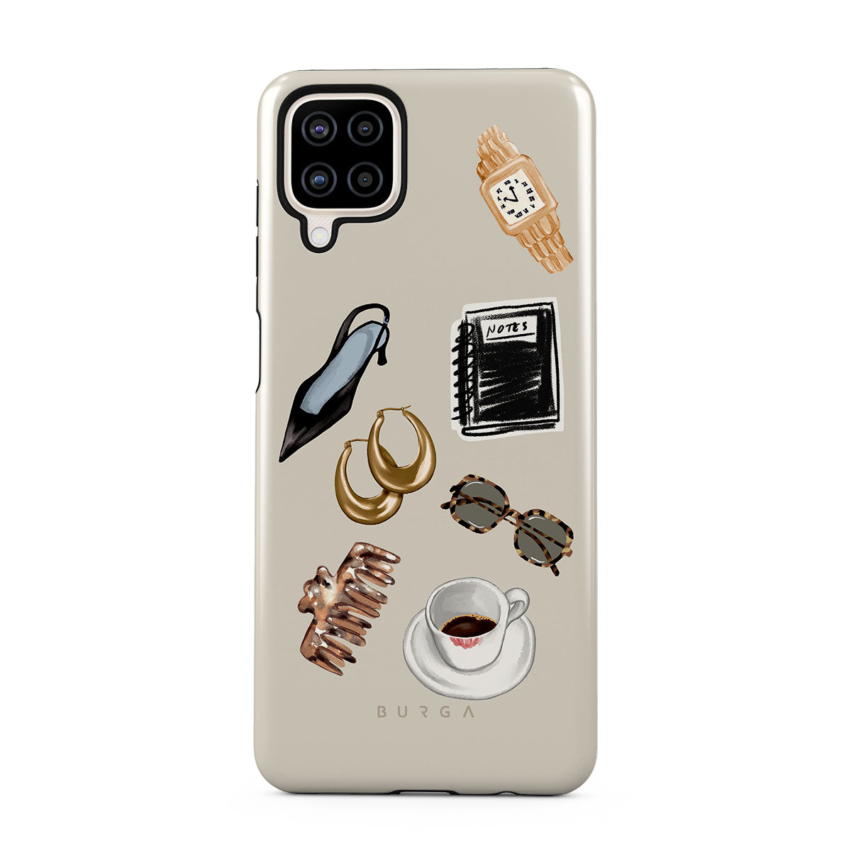 Este design contém: salto alto preto, argolas douradas, caderno preto, chávena de café, óculos com padrão tartaruga, scrunchie castanho, relógio dourado retro.