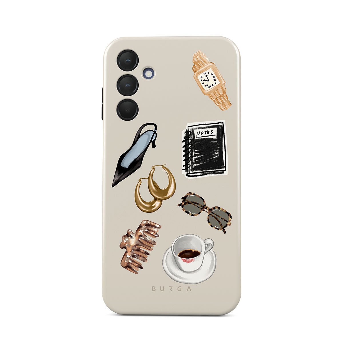 Este design contém: salto alto preto, argolas douradas, caderno preto, chávena de café, óculos com padrão tartaruga, scrunchie castanho, relógio dourado retro.