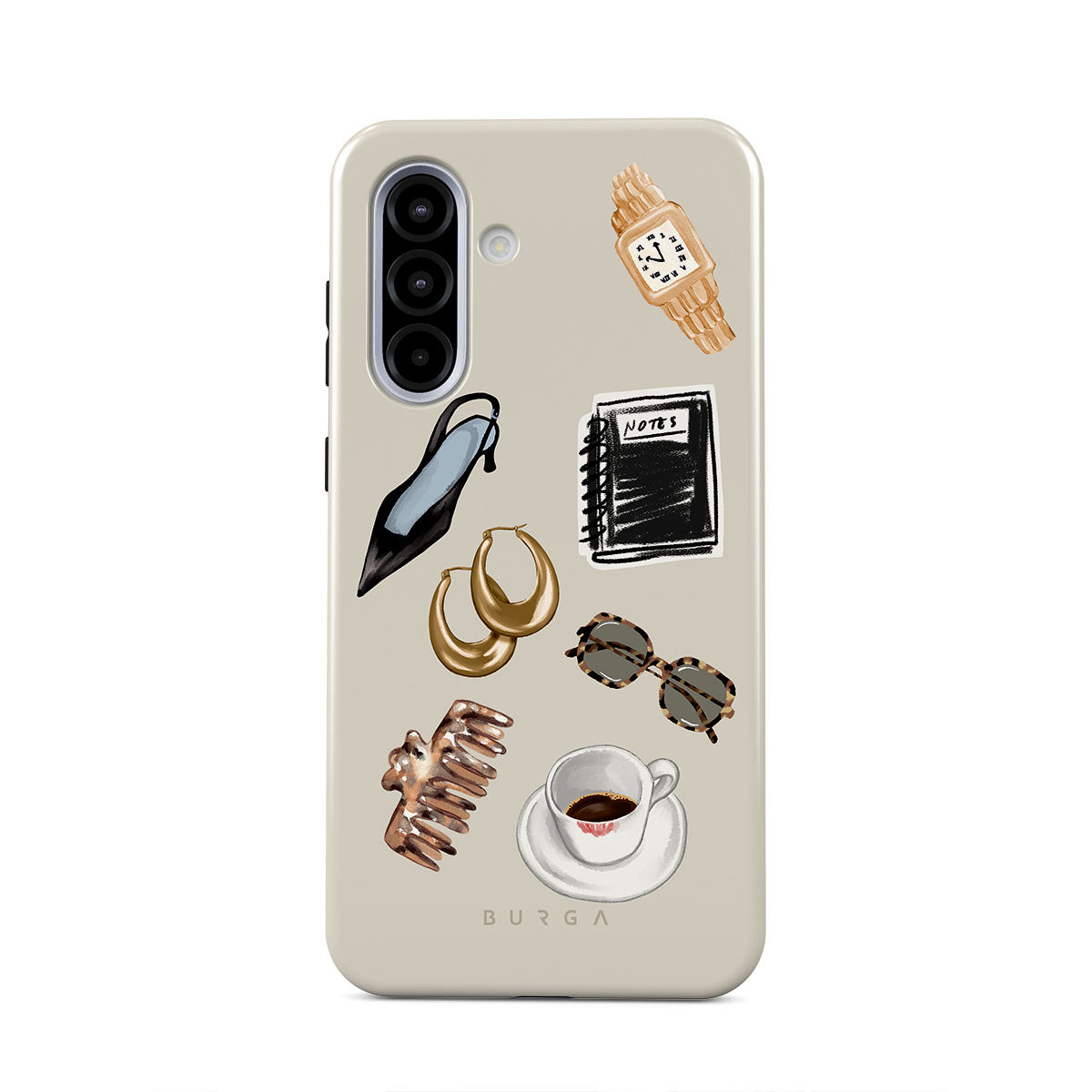 Este design contém: salto alto preto, argolas douradas, caderno preto, chávena de café, óculos com padrão tartaruga, scrunchie castanho, relógio dourado retro.