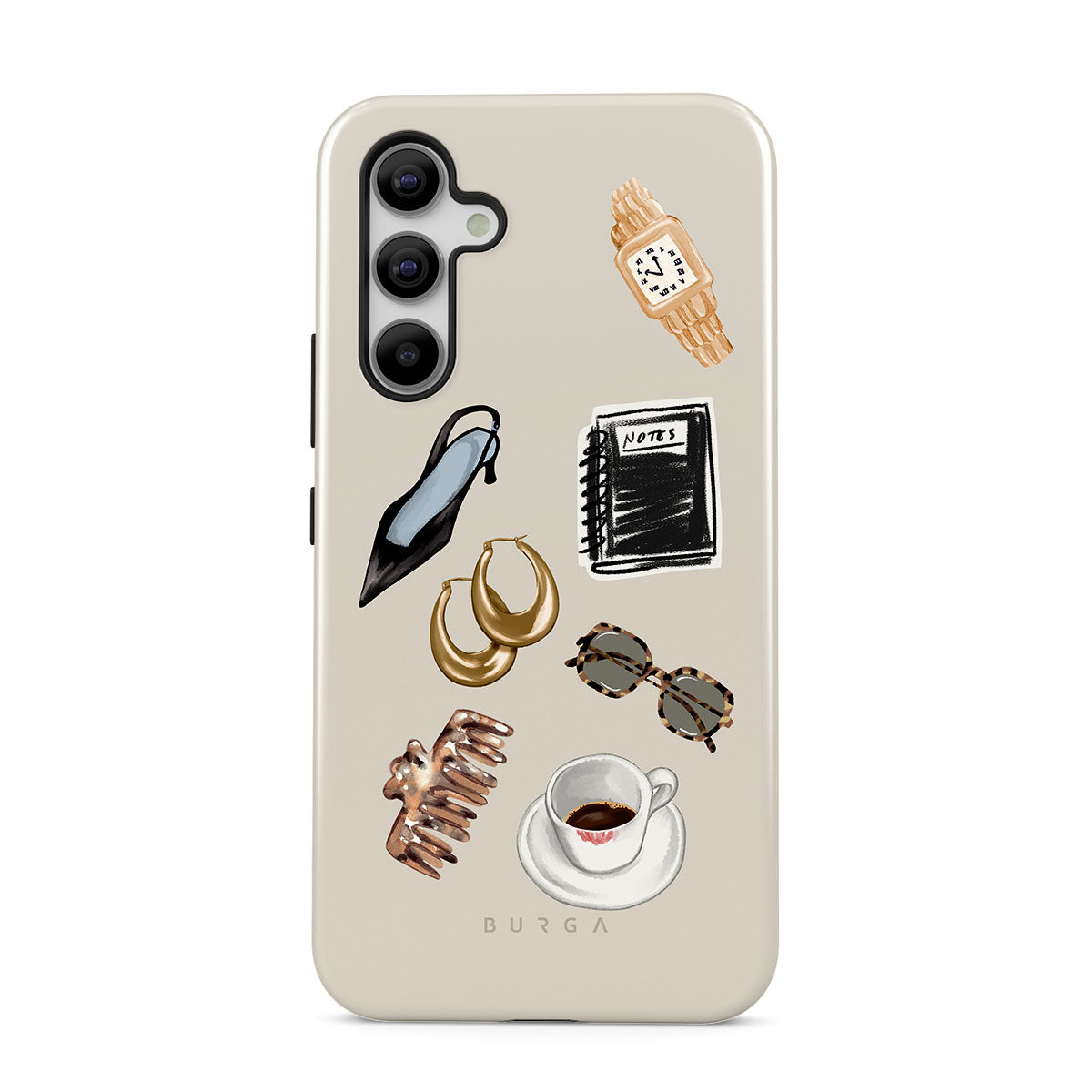 Este design contém: salto alto preto, argolas douradas, caderno preto, chávena de café, óculos com padrão tartaruga, scrunchie castanho, relógio dourado retro.