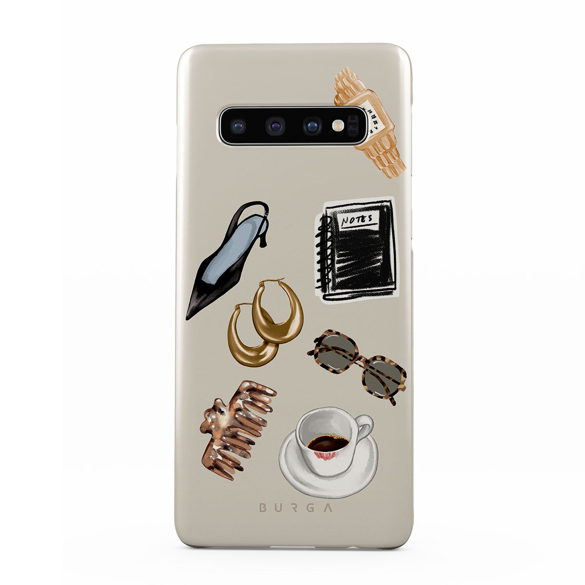 Este design contém: salto alto preto, argolas douradas, caderno preto, chávena de café, óculos com padrão tartaruga, scrunchie castanho, relógio dourado retro.