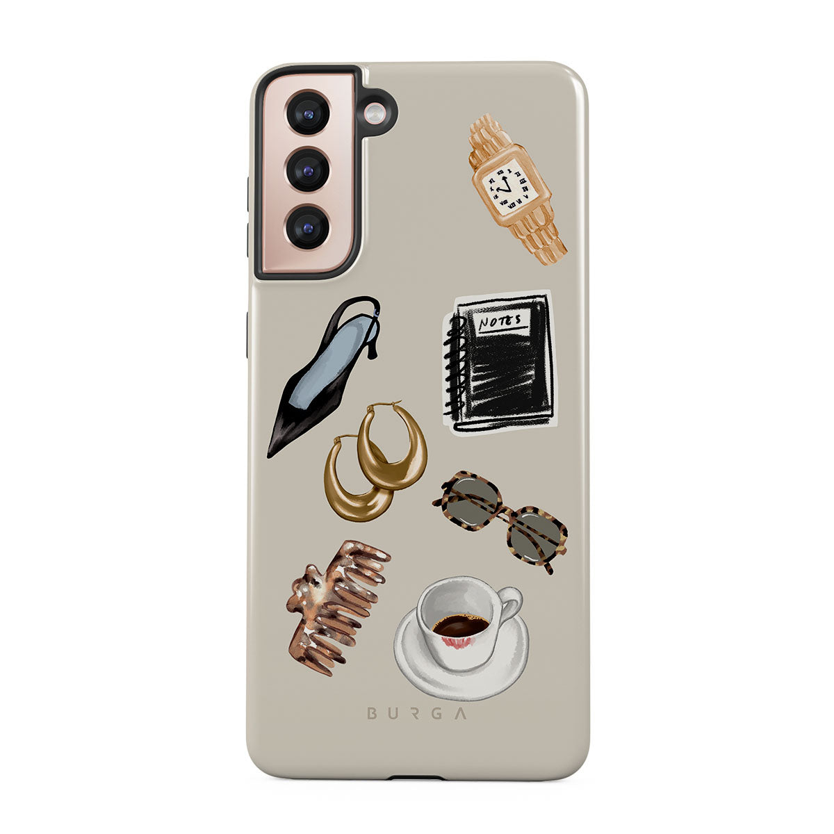 Este design contém: salto alto preto, argolas douradas, caderno preto, chávena de café, óculos com padrão tartaruga, scrunchie castanho, relógio dourado retro.