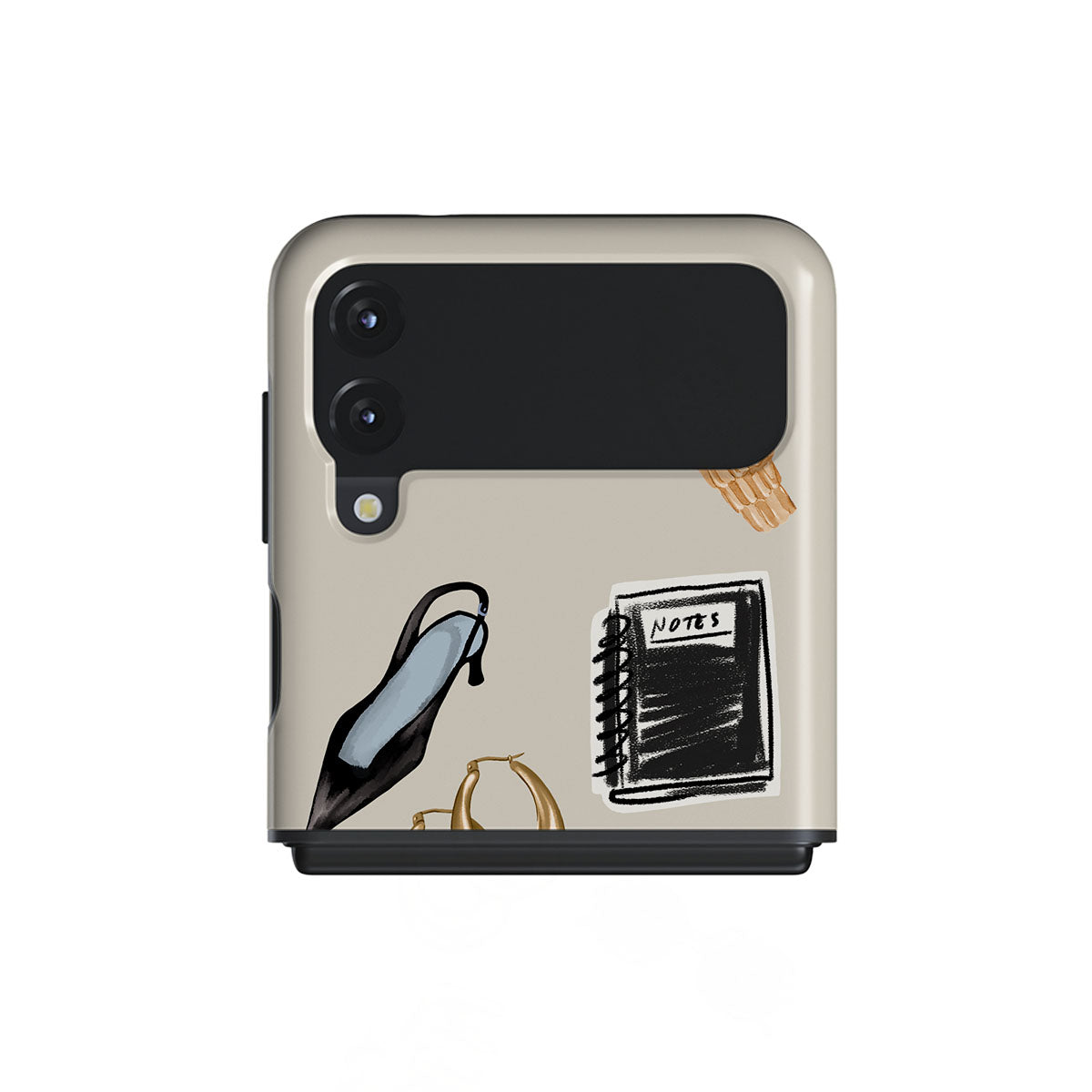 Este design contém: salto alto preto, argolas douradas, caderno preto, chávena de café, óculos com padrão tartaruga, scrunchie castanho, relógio dourado retro.