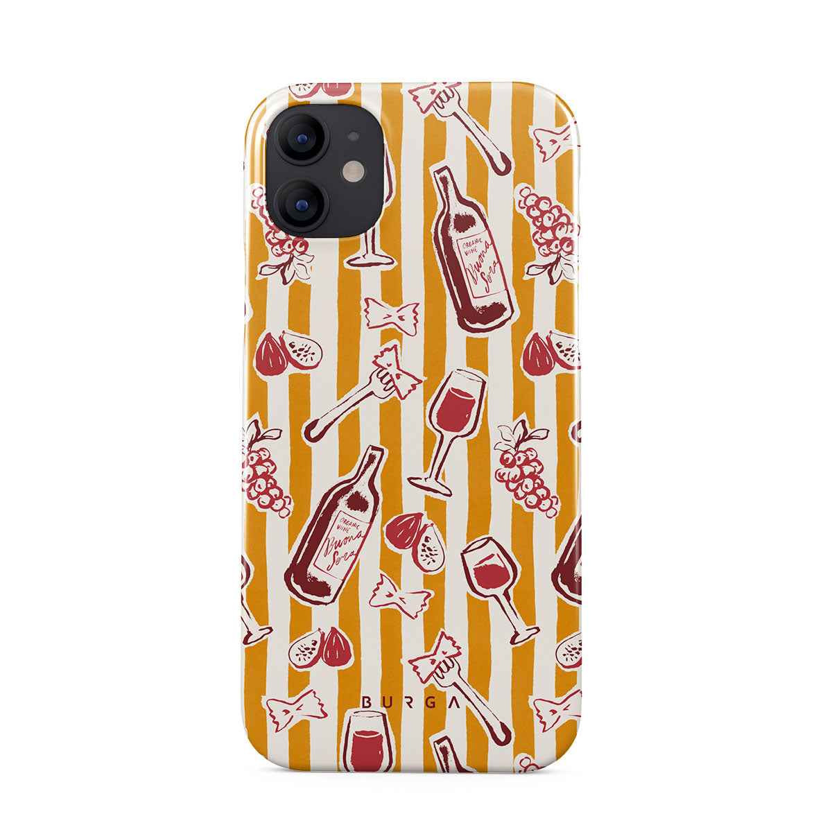 Este design contém: fruta, figos, uvas, garfos, massa, vinho, copo, riscas.