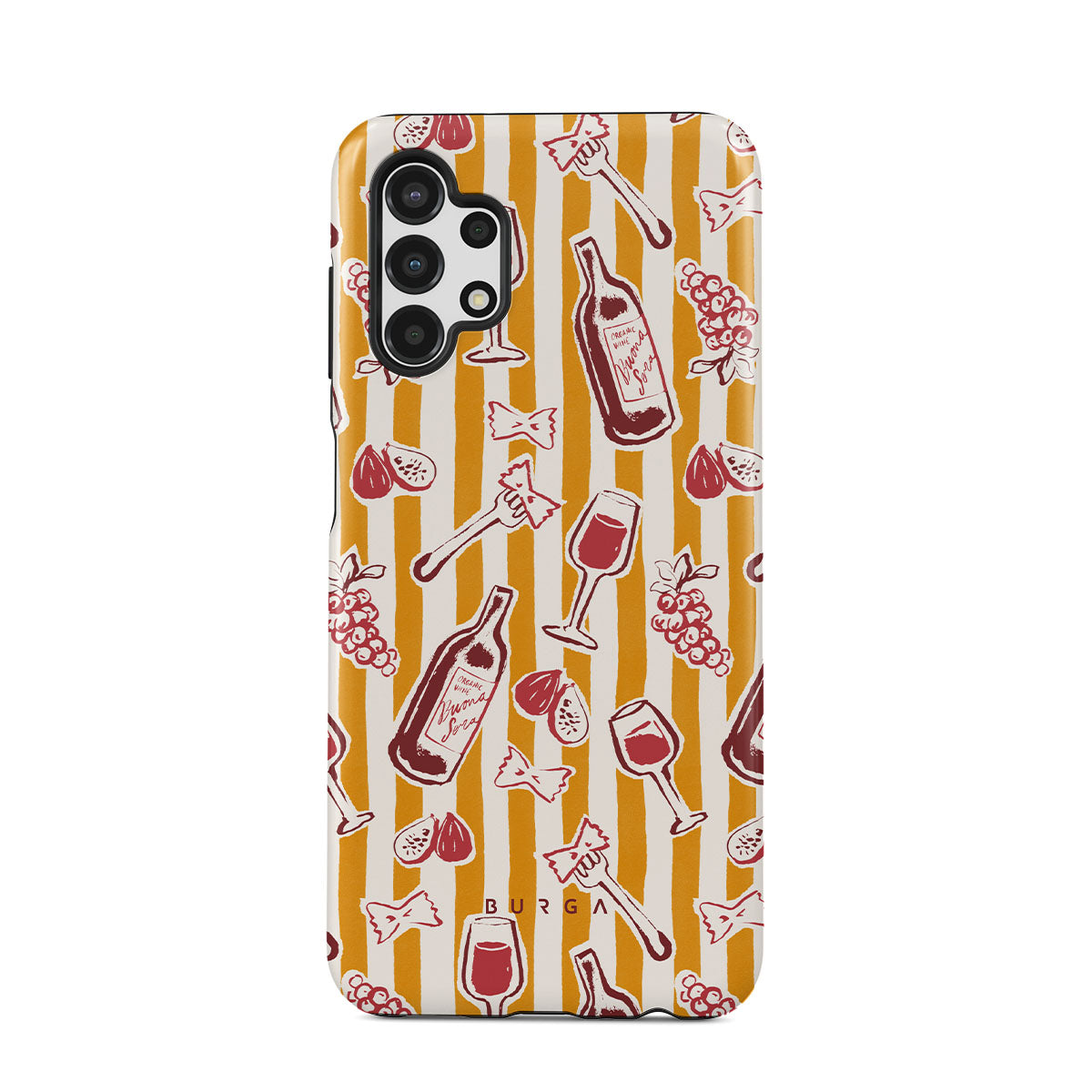 Este design contém: fruta, figos, uvas, garfos, massa, vinho, copo, riscas.