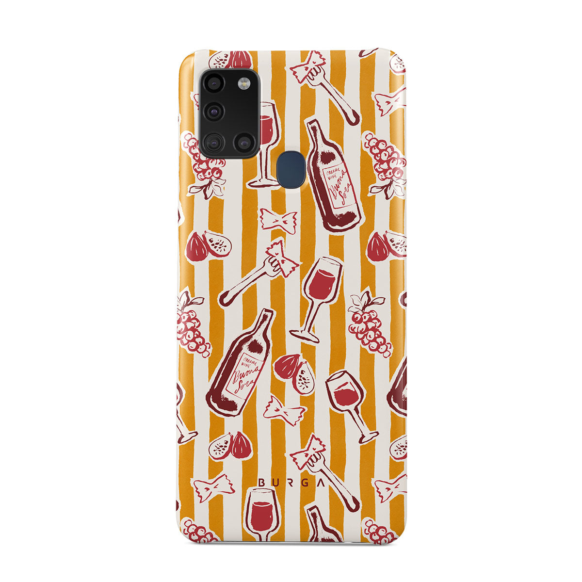 Este design contém: fruta, figos, uvas, garfos, massa, vinho, copo, riscas.