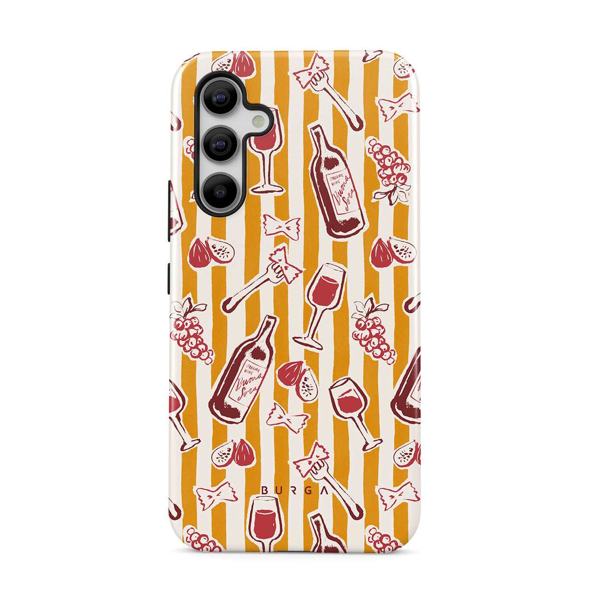 Este design contém: fruta, figos, uvas, garfos, massa, vinho, copo, riscas.