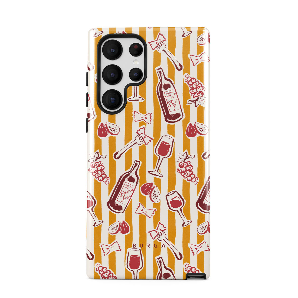 Este design contém: fruta, figos, uvas, garfos, massa, vinho, copo, riscas.