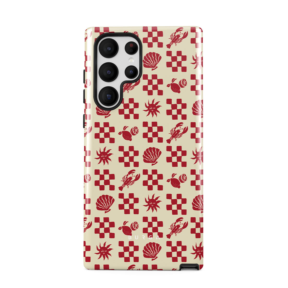 Este design contém:Padrões quadriculados vermelhos, conchas, lagosta, motivos italianos.