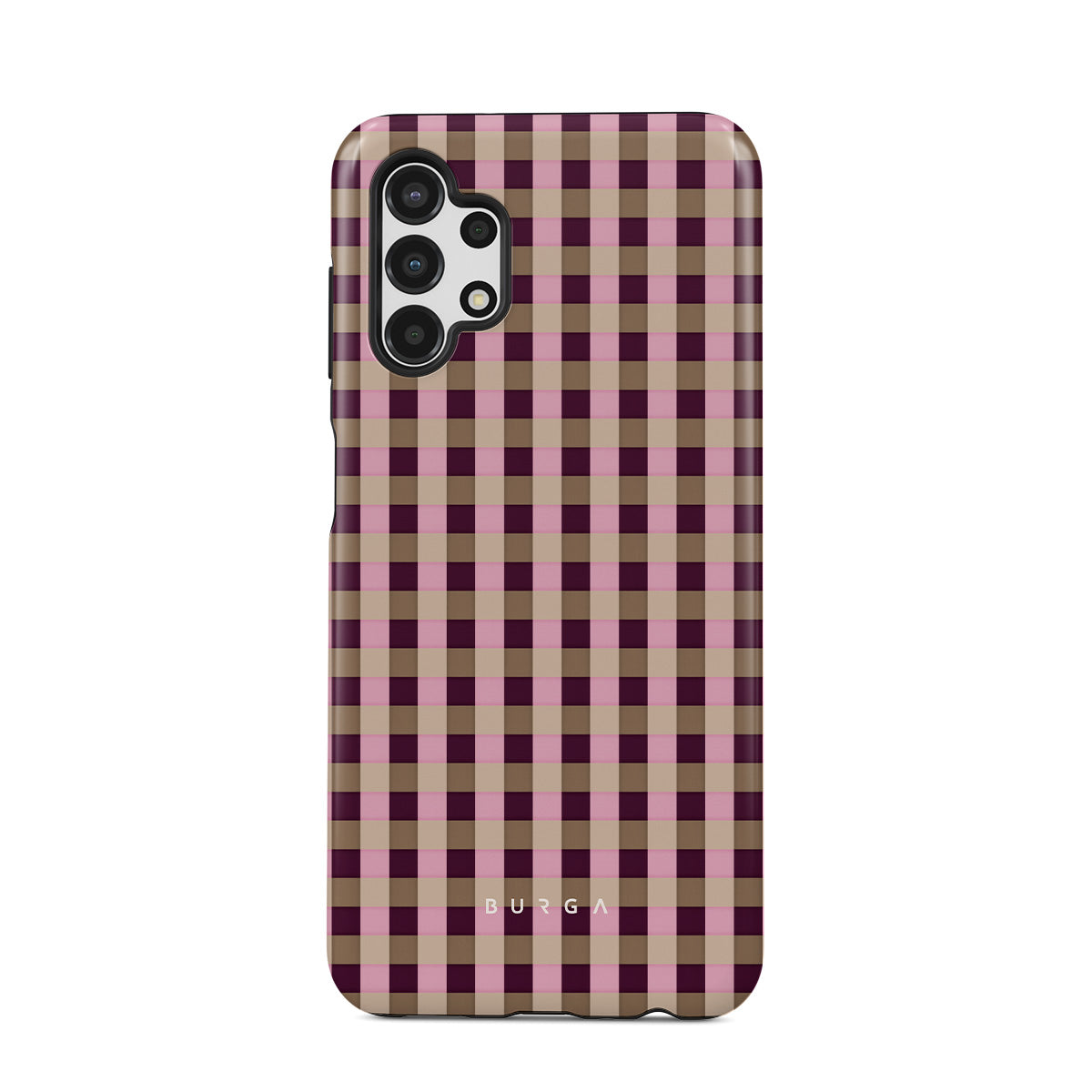 Este design contém: padrão xadrez rosa e bordô em estilo moderno.