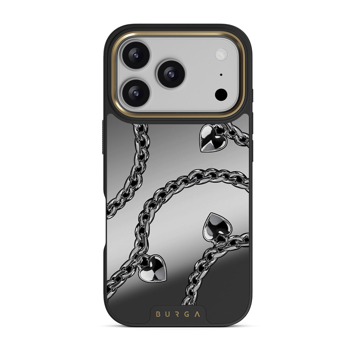 Este design contém: correntes, corações, prateados, detalhes metálicos, espelho