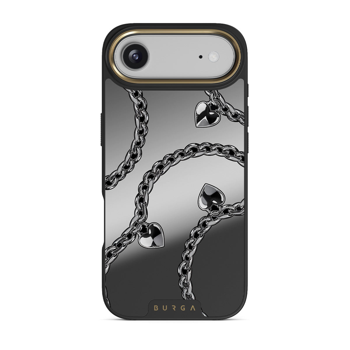 Este design contém: correntes, corações, prateados, detalhes metálicos, espelho