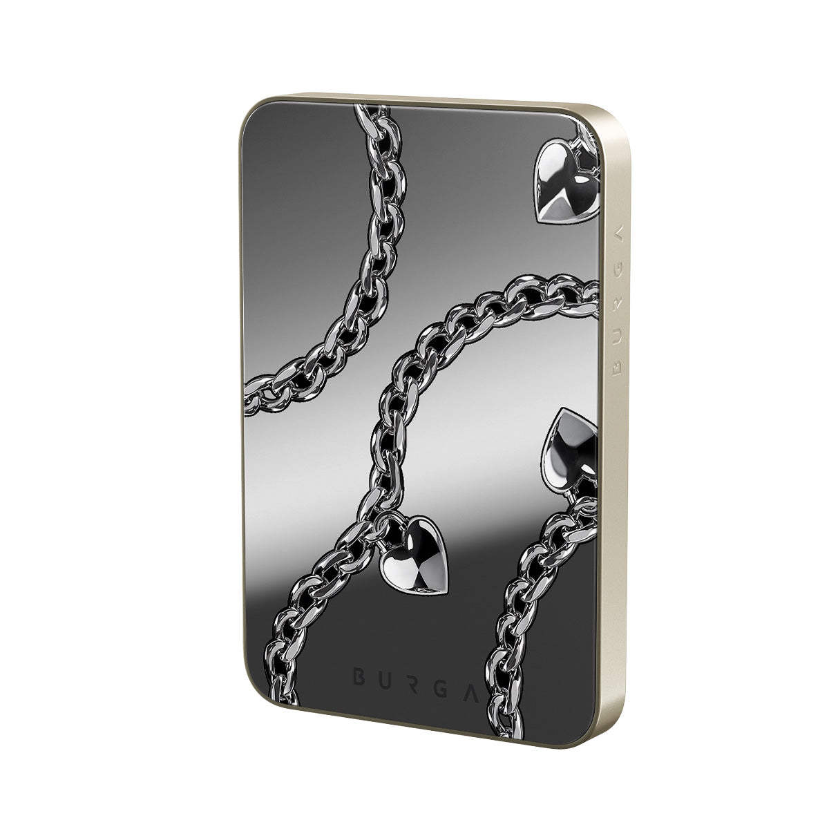 Este design contém: correntes, corações, prateados, detalhes metálicos, espelho