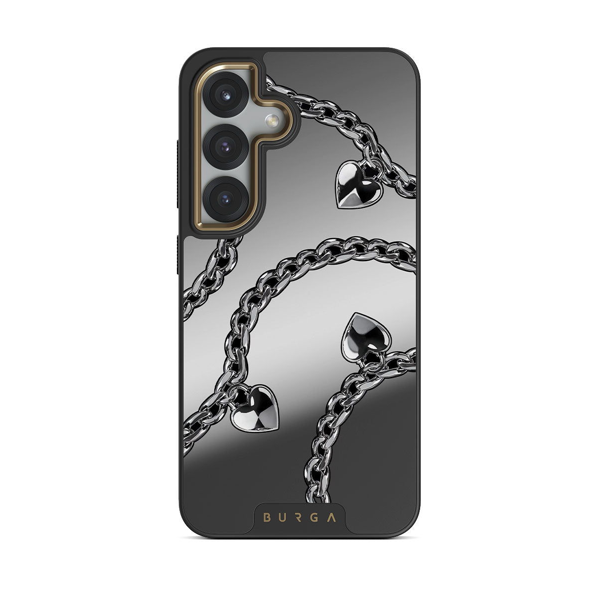 Este design contém: correntes, corações, prateados, detalhes metálicos, espelho