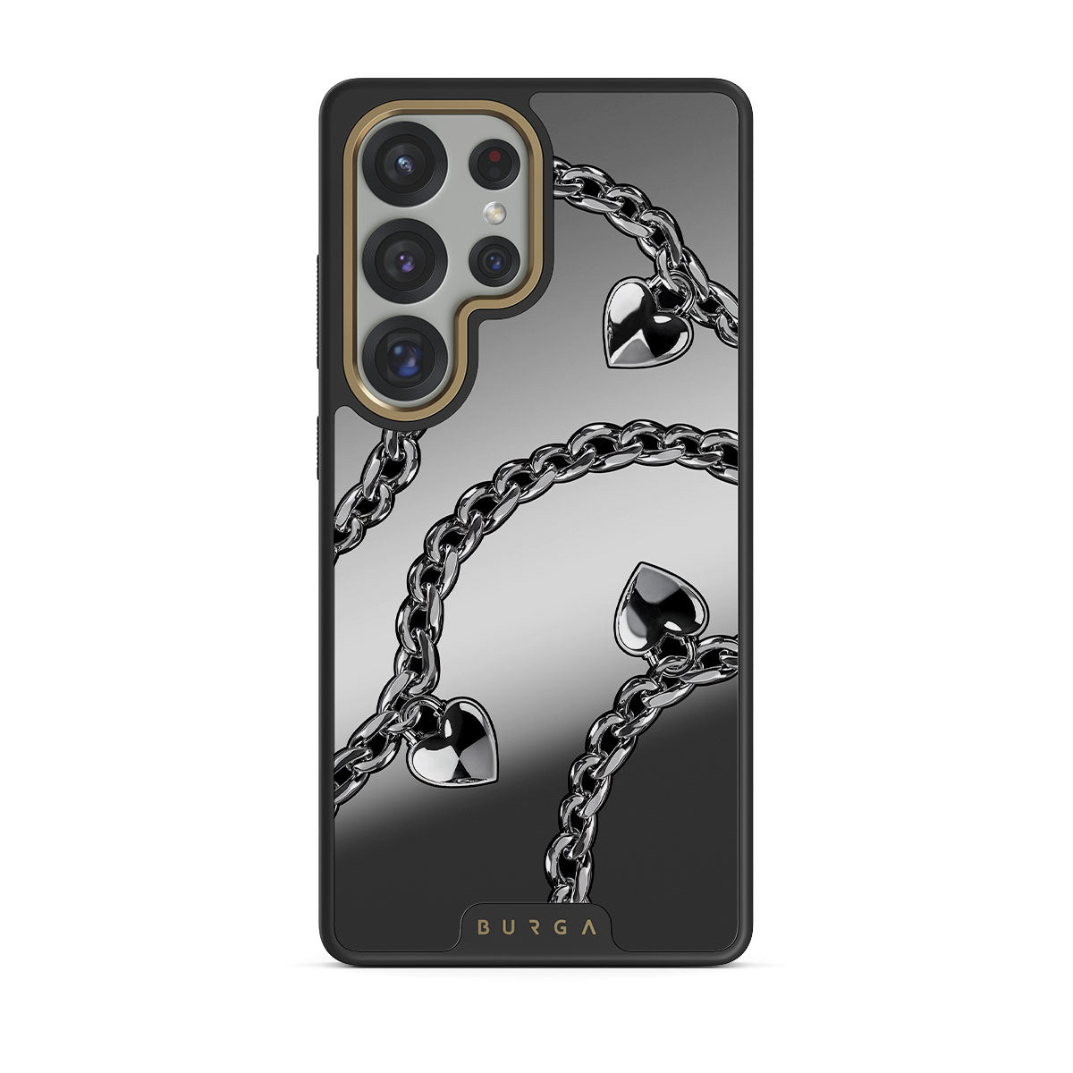 Este design contém: correntes, corações, prateados, detalhes metálicos, espelho