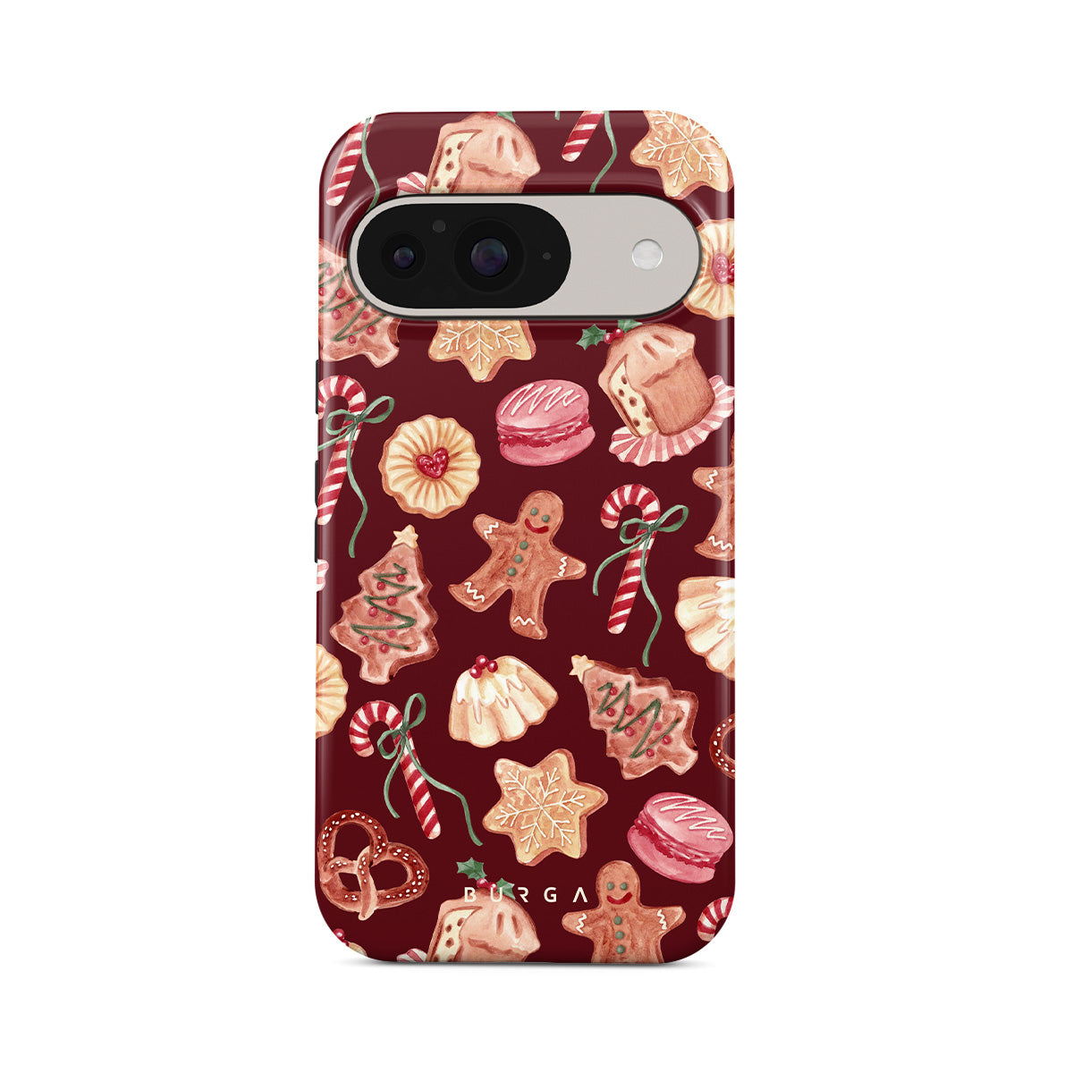 Este design contém: biscoitos de Natal, homens de gengibre, bengalas de doce, doces de hortelã, guloseimas festivas, fundo vermelho bordô
