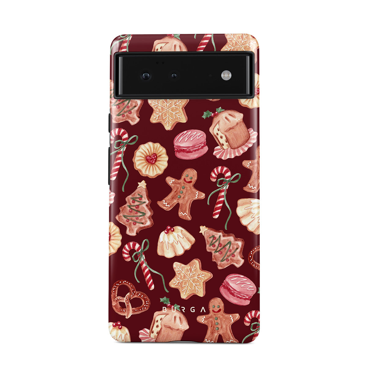 Este design contém: biscoitos de Natal, homens de gengibre, bengalas de doce, doces de hortelã, guloseimas festivas, fundo vermelho bordô