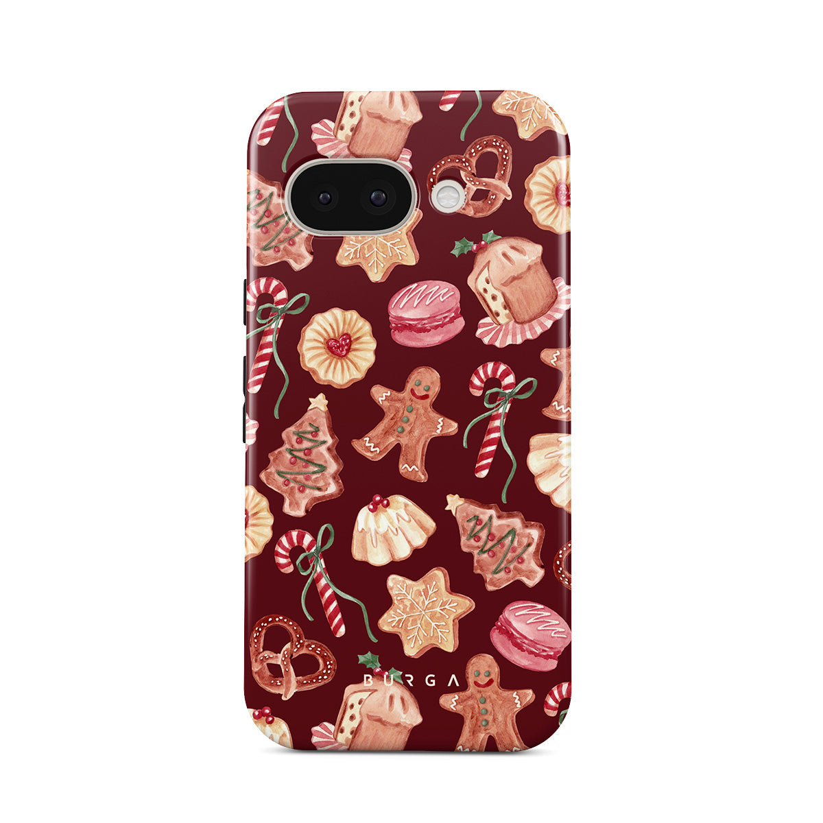 Este design contém: biscoitos de Natal, homens de gengibre, bengalas de doce, doces de hortelã, guloseimas festivas, fundo vermelho bordô