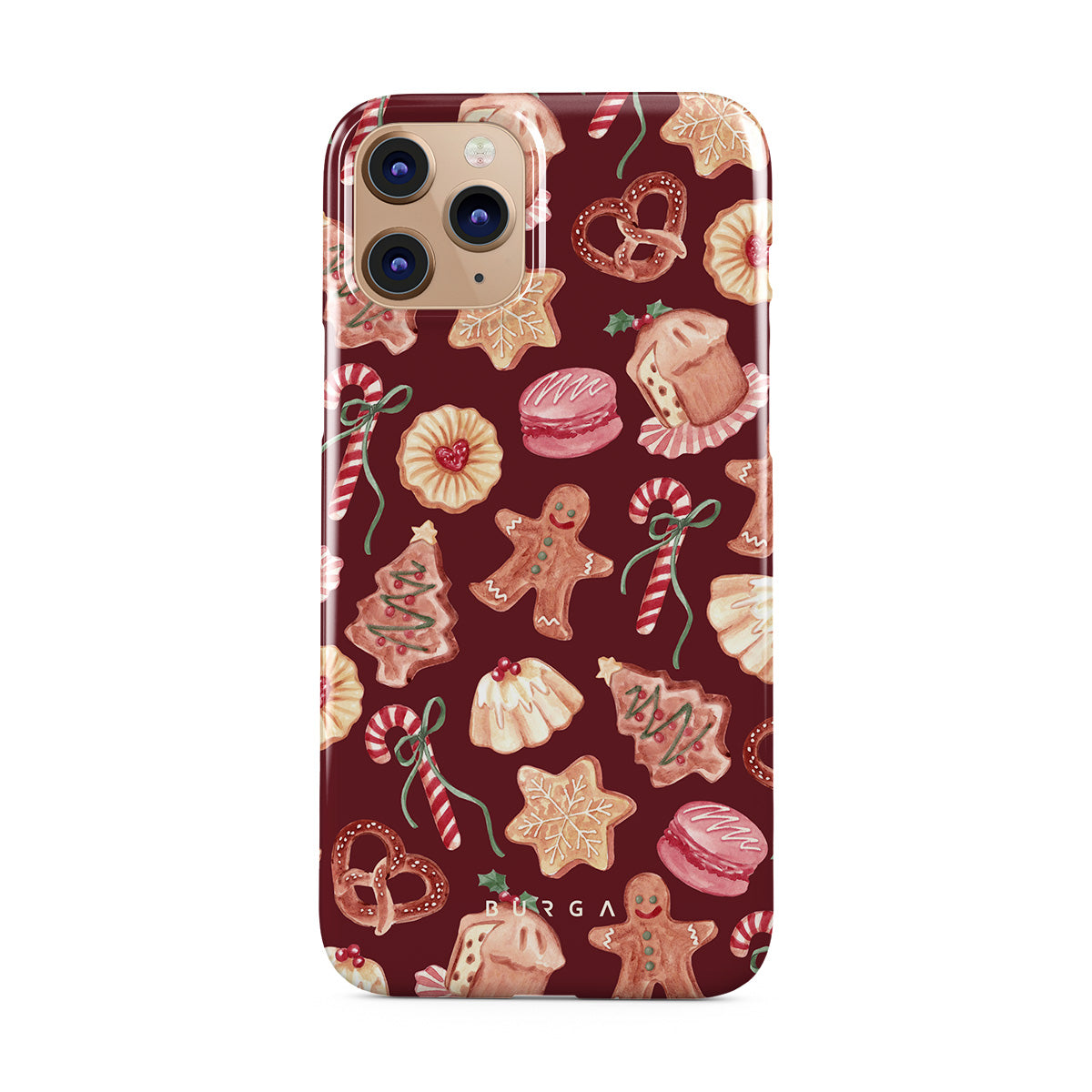 Este design contém: biscoitos de Natal, homens de gengibre, bengalas de doce, doces de hortelã, guloseimas festivas, fundo vermelho bordô