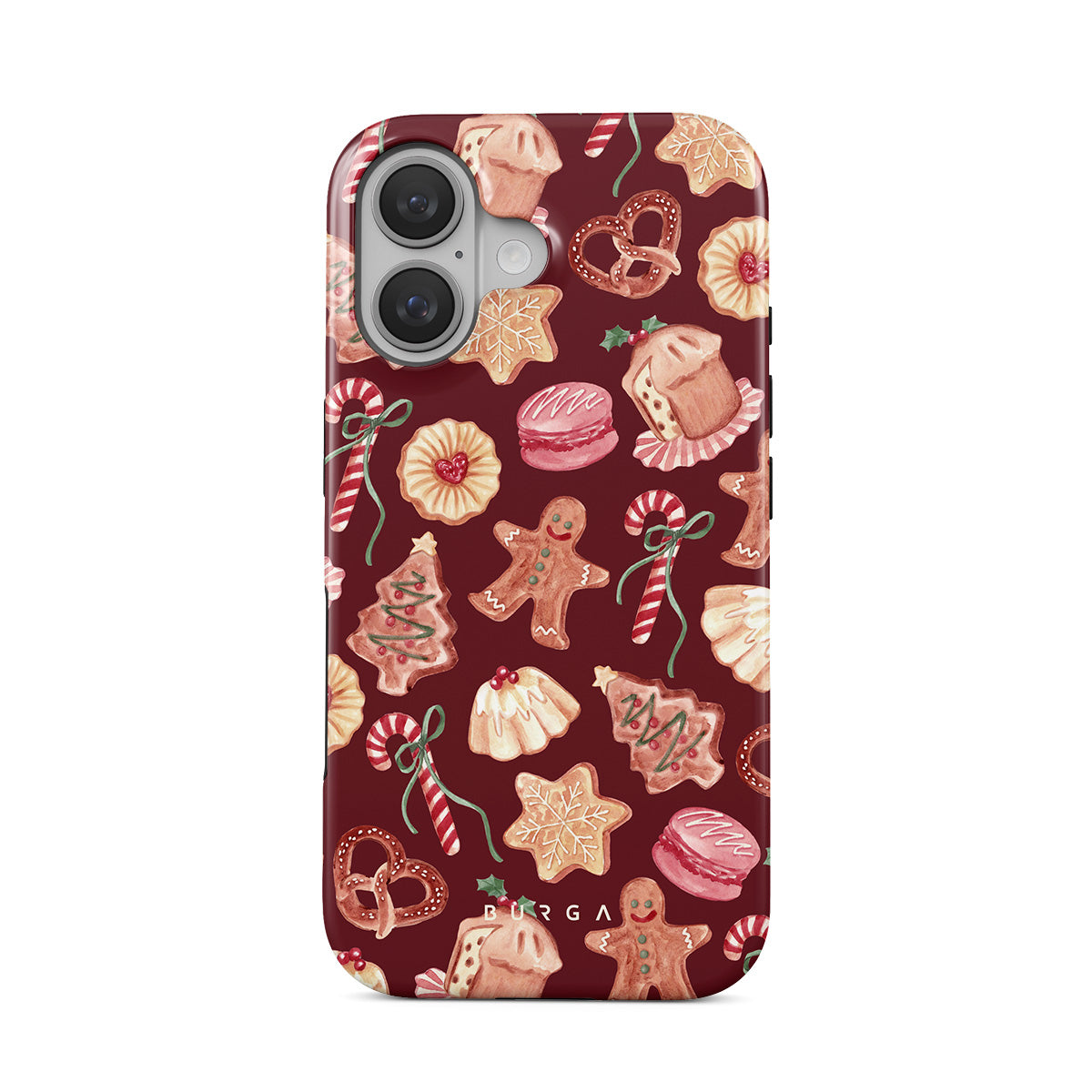 Este design contém: biscoitos de Natal, homens de gengibre, bengalas de doce, doces de hortelã, guloseimas festivas, fundo vermelho bordô