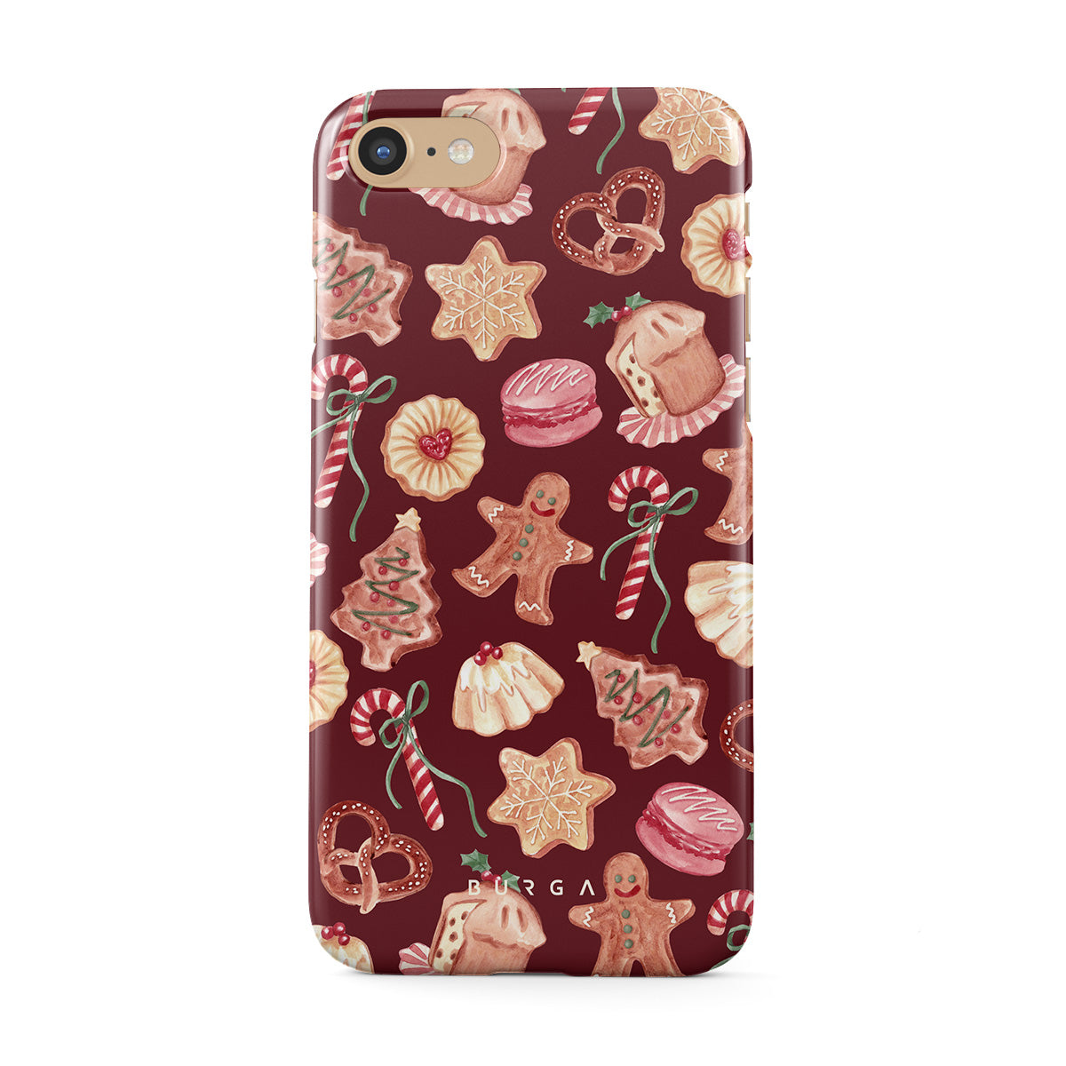 Este design contém: biscoitos de Natal, homens de gengibre, bengalas de doce, doces de hortelã, guloseimas festivas, fundo vermelho bordô